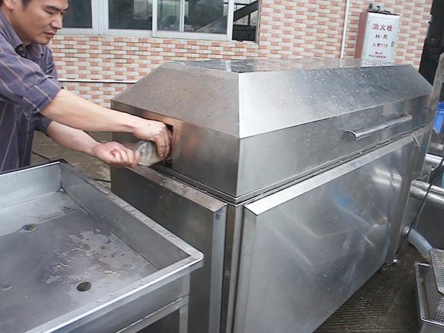 機內(nèi)有高壓噴淋系統(tǒng),去除魚鱗,沖走內(nèi)臟。