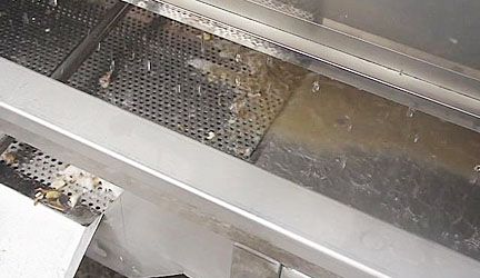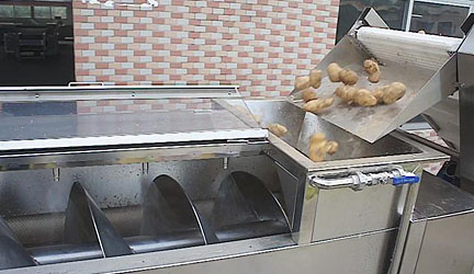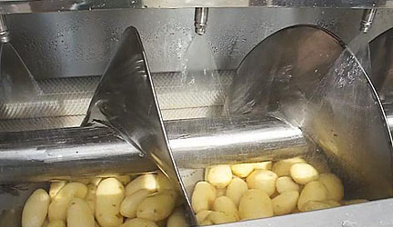 物料在清洗槽內(nèi)由螺旋葉向前推動,和毛刷摩擦接觸,并由機器上部的高壓噴嘴噴淋,從而達到連續(xù)清洗去皮的效果。
