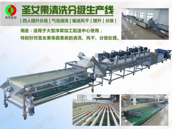 圣女果生產(chǎn)線,當中有對果體進行清洗的步驟,采用氣泡清洗,清洗分離被清洗物表面附著物,模擬人工清洗基本動作并盡量減少了人工清洗中的碰、磕、劃傷等現(xiàn)象,提 高了工作效率,變?nèi)斯ぷ鳂I(yè)為機械化加工。適合于各種新鮮蔬菜、鹽漬菜、菌類、海產(chǎn)品。根據(jù)所清洗物料比重的不同,設計了兩種型號:全 網(wǎng)帶型、半網(wǎng)帶型。半網(wǎng)帶型適合于物料比重小于或等于水的物料,全 網(wǎng)帶型適合比重大于水或怕碰傷的物料。