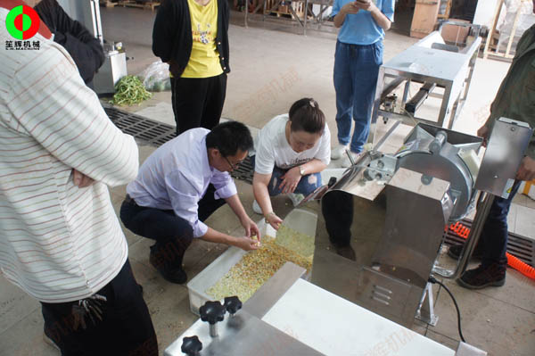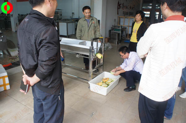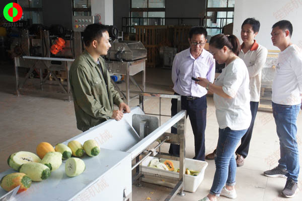客戶親臨我司測試木瓜削皮、瓜果切丁及蔬果分瓣等加工處理設(shè)備!
