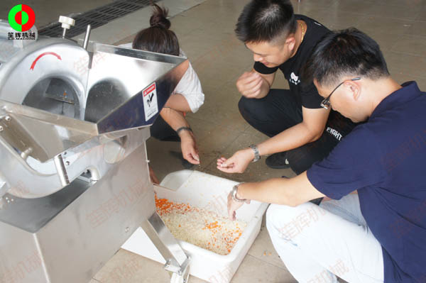 瓜果三維切丁機測試效果滿意,客戶付款購買隨車運走! 高速切丁機可把條狀球狀的瓜果,如蘿卜,土豆,芋頭,紅薯,黃瓜,洋蔥,辣椒等等,特別是柔軟多汁類的瓜果,如芒果,菠蘿,木瓜,蘋果,草莓,竹筍,火腿等等,快速切丁或者切條,操作安*全,切丁速度快,一臺機相當數(shù)十人的工作量。