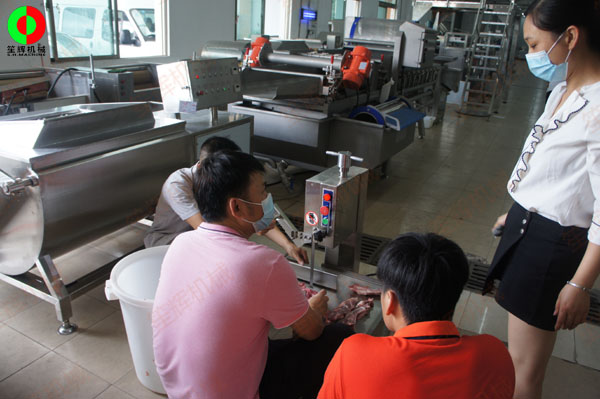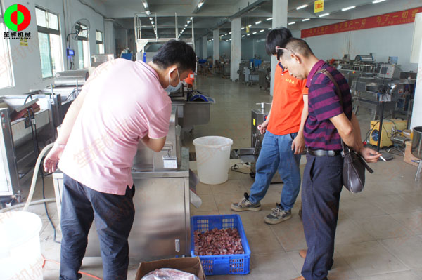 佛山某肉食品加工配送中心客戶一行人親臨我司測試訂購洗排骨機(jī)等設(shè)備!