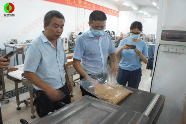 東莞客戶一行考察我司生產(chǎn)制造及售后實力,現(xiàn)場測試真空包裝機的實際使用操作效果,并下單購買。真空包裝機是將包裝袋內抽成真空后立即自動封口,使得袋內殘留氣體少,從而抑制細菌等微生物的繁殖,避免物品的氧化霉變和腐敗,延長物品的儲存時間。笙輝雙室真空包裝機采用不銹鋼精制而成,具有結構合理、外表美觀、穩(wěn)定耐*用、氣密性好、封口質量高等特點。