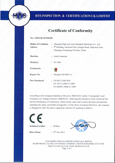 大蒜分瓣機(jī)獲得CE認(rèn)證